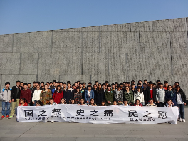 临近12月13日南京大屠杀死难者国家公祭日,为了引导激励青年坚定中国特色社会主义理想信念,培育和践行社会主义核心价值观,11月14日建筑工程学院关工委以“践行社会主义核心价值观--勿忘国耻,圆梦中华”为主题,组织参观了南京大屠杀纪念馆。通过本次主题团日活动,关工委全体成员深刻认识到中国人民为反对侵略战争、捍卫人类尊严、维护世界和平付出的努力和代价,并将延续先辈们的精神,在今后的工作中更加努力,充分发挥"奉献、友爱、互助、进步"的精神,服务社会。同时我们深信,在我院关工委深入开展活动的同时,关工委的工作也将更加深入人心。
