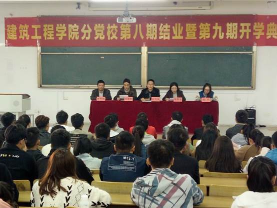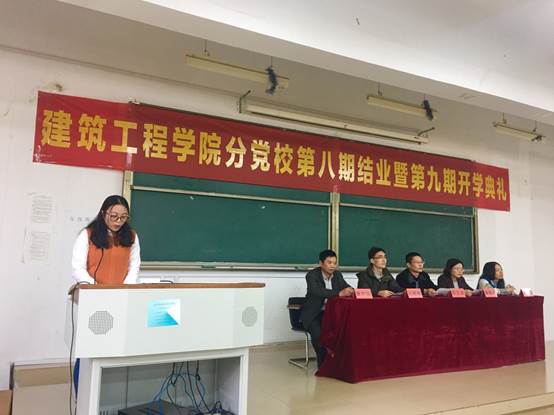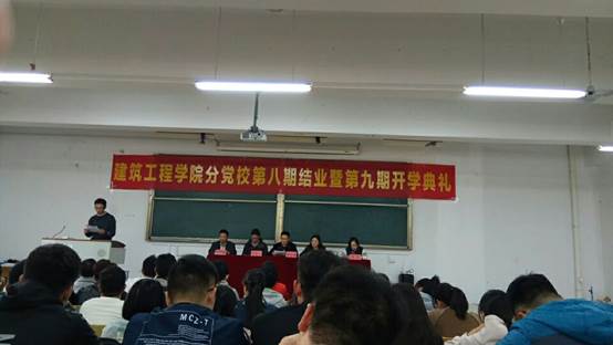 2017年11月8日下午15点50分,建筑工程学院分党校第八期结业暨第九期开学典礼在广宇楼101如期举行。出席本次典礼的有建筑工程学院党总支书记、分党校校长张文斌书记,党总支祁顺彬副书记,第二党支部唐喜芬书记,第二党支部组织委员、党校班主任倪丹老师,关工委唐利国老师以及第八期优秀学员和第九期党校学员。