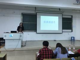 第二阶段,于2018年5月9号晚上18点在广宇楼101教室举办“经典阅读月”朗诵经典、推荐经典的比赛。比赛共有24位同学拿出自己喜欢的经典著作,就在阅读书籍中的感悟与心得做了深入交流。其中,徐春飞同学用中英文结合的方式向同学们推荐了《成功人士需要具备的七个要素》这本书,激励同学们不断创新自我,提高自我。通过这场比赛同学们不仅向大家推荐了自己喜欢的书籍,也从别人的分享中有所收获,更得到了一次宝贵的锻炼自己的机会。