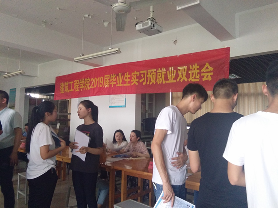 6月27日下午,建筑工程学院2019届毕业生实习预选双选会在广宇楼302举行。参会单位有江苏沪宁钢机,中建二局、江苏中南建筑产业集团、浙江至方建设等12家企业,主要来自于苏浙皖地区,向我院2019届建筑工程技术专业的44名毕业生提供了包括施工员、安全员、资料员、监理员、测量员在内超过100个对口率极高的实习岗位。