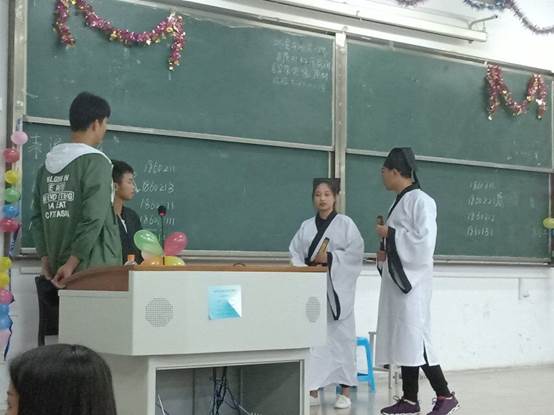 为更好地传承与弘扬中国传统文化,将传统文化与生活结合,让学生在紧张刺激的比赛中感受中国传统文化的魅力,潜移默化的提升同学们的传统文化修养,增强同学们的民族荣辱观念,特开展本次比赛。来自建工182班的12名同学带来的《作家之死》,透过那厚厚的剧本,精湛的演技,就可得知他们为此次活动做了许多准备。不仅如此,其他选手带来的表演各具特色。有的篇幅较长情景动人,有的篇幅短小却幽默风趣。从每班的表演中我们都能感受到浓浓的传统气息。最后,造价182班的《梁山伯与祝英台之十八相送》拔得头筹。