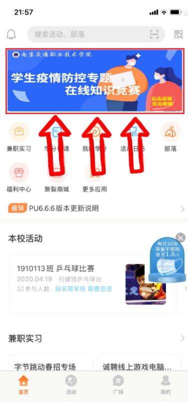 在首页-上方宣传页中找到“学生疫情防控专题在线知识竞赛”标识,点击海报封面进行竞赛答题