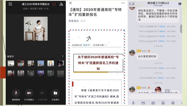 二、点面宣传。对于2020年“专转本”专项工作,建筑工程学院通过点面结合方式进行通知与宣传。辅导员、班主任、学生干部通力合作,确保通知到每一位学生。学院利用官网、“青春建筑”微信公众号推送相关通知;班级利用QQ群、微信群和班团干部群分别发布相关通知。班主任利用群接龙的方式确认同学收到消息,尤其是1月已报名的学生,对于没有回复的同学单独电话联系告知相关事项和要点,确保每位学生都已知晓“专转本”新情况。