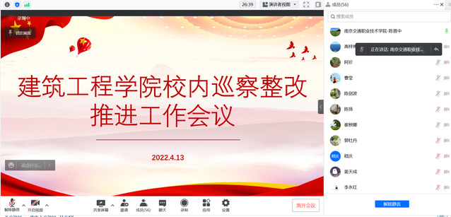 4月13日下午,建筑工程学院召开校内巡察整改推进线上工作会议,会议由陈晋中书记主持,全体教职工参会。