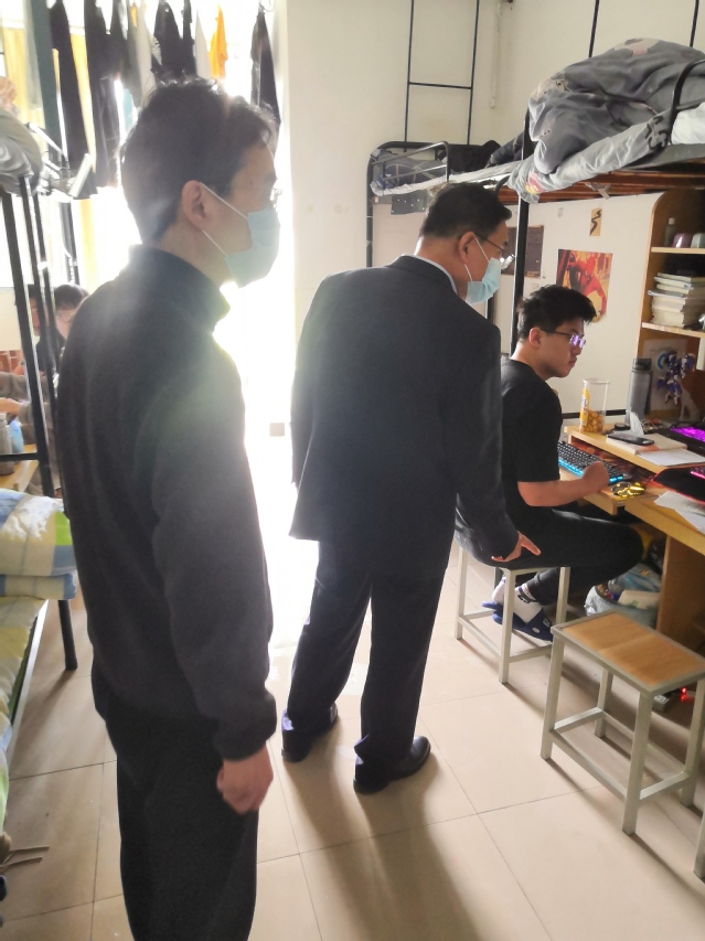 陈书记、祁院长先后带着辅导员们走访了学生宿舍A、D、F和J栋,在走访过程,陈书记勉励同学们在封校期间要提高自律意识,做自己学习、生活上的主人,多学习,多思考;要多走出宿舍,加强体育锻炼,练就过硬身体素质,培养健康的身心;同时也要营造良好的宿舍环境,始终保持宿舍干净、卫生、整洁。祁院长叮嘱同学们要按时参加线上上课,养成良好的学习习惯,不断提高学习的积极性、主动性和创造性。