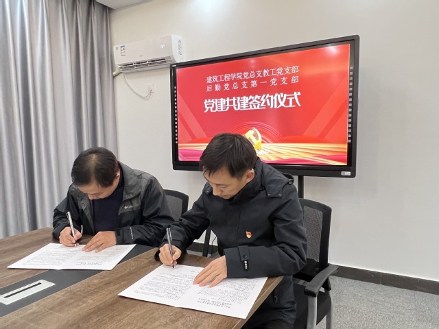 建筑工程学院教工党支部委员朱祥亮和后勤第一党支部书记王丹代表签订了《党建结对共建协议书》。签约仪式后,双方进行了深度的党建交流。