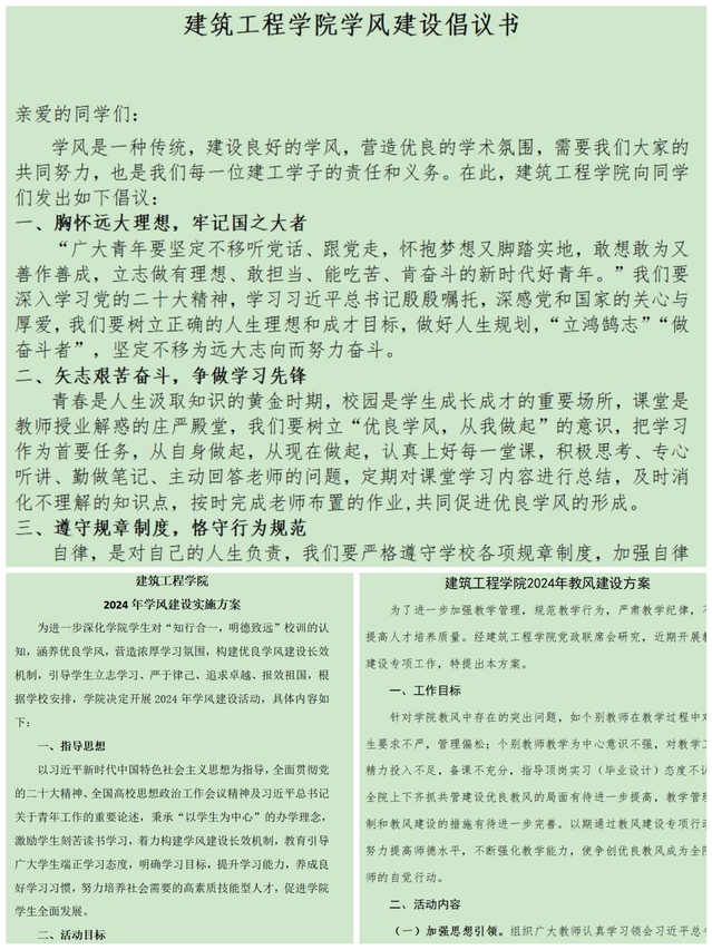 一是加强组织领导,完善顶层设计。建筑工程学院分别制定《建筑工程学院2024年教风建设方案》及《建筑工程学院2024年学风建设方案》,用制度文件指引各项工作有序开展;成立建筑工程学院教风学风建设领导小组,加强领导对教风学风建设的管理与指导。