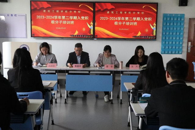 建筑工程学院于2024年4月24日下午在广宇楼409教室举办第44期入党积极分子培训班开班仪式。出席本次会议的有建筑工程学院党总支书记陈晋中、第二党支部书记曹莹、党总支委员沈月老师、党校班主任汤蕊冰老师以及参加本次培训班的所有入党积极分子,开班仪式由曹莹老师主持。
