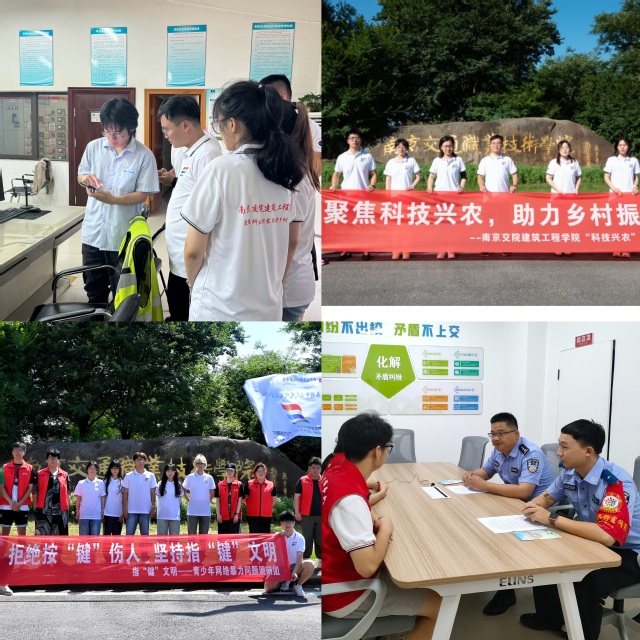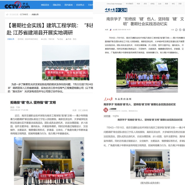 建筑工程学院团总支31个团支部积极响应、认真开展,以“返家乡实践”、志愿服务、暑期实习等不同形式参加了2024年度暑期社会实践活动,以汗水筑牢中华民族伟大复兴的中国梦,以青春为中国式现代化挺膺担当,以行动践行“强国有我”青春誓言。在此基础上,团总支层面由4名指导教师和18名优秀学生组成了2支重点团队,分别在南京、镇江、盐城等地开展社会实践活动。指“键”文明-青少年网络暴力问题调研团队前往江宁区人民检察院、高新区派出所、大学城及附近街道社区开展普法实践活动,他们走进机关,访谈治理困境;步入校园,创作主题手绘;涌向街头,开展宣传调研。聚焦科技兴农,助力乡村振兴实践团队实地走访光伏发电基地和江苏中压公司光伏发电项目,与江苏中压公司、南京航空航天大学签署合作协议,共同就柔性光伏支架健康监测开展科技攻关。