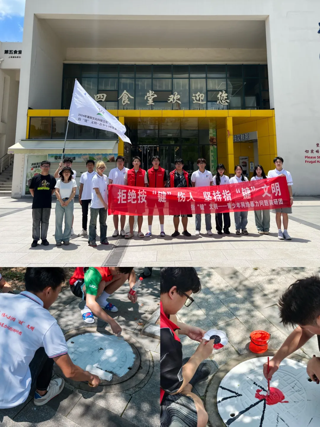 7月8日,南京交通职业技术学院建筑工程学院与南京工程学院艺术与设计学院联合组队“指‘键’文明——青少年网络暴力问题调研”暑期社会实践团队开展“‘小’画笔‘大’文明”反对网络暴力校园彩绘活动。