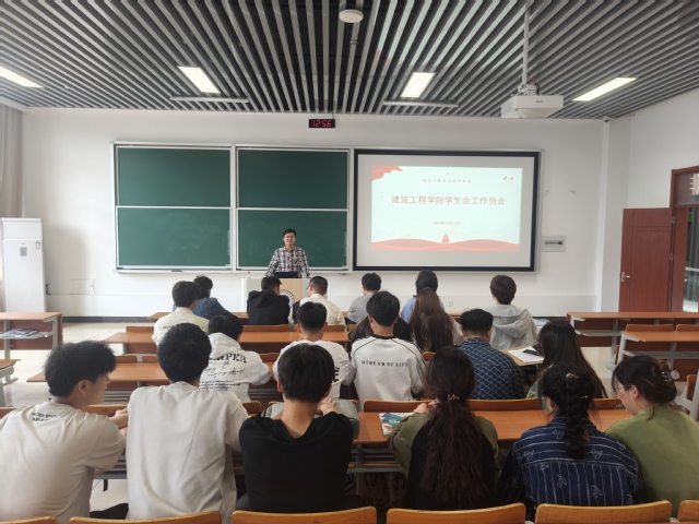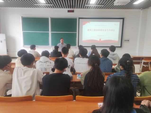 为进一步加强学生会干部队伍建设,确保学院学生工作有序平稳开展,10月12日下午1点,建筑工程学院在明德楼104教室召开学生会工作例会,建筑工程学院党总支副书记彭涌涛、辅导员杨步及全体学生会干部参加会议。