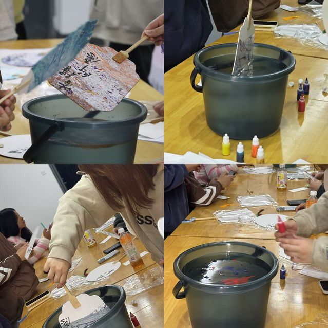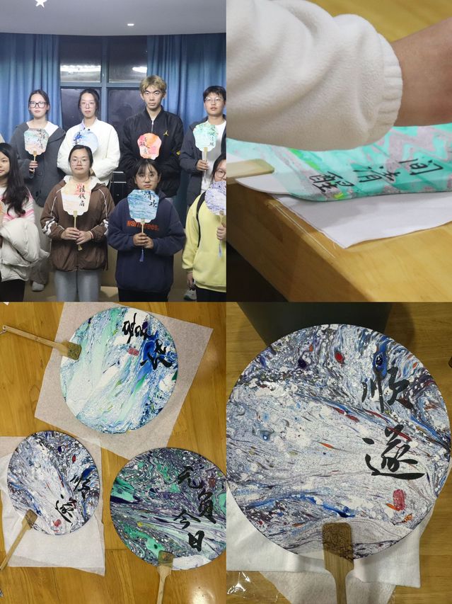 活动现场热闹非凡,五彩斑斓的漆扇令人目不暇接。首先,参与者们在筑心工作人员的指导下,手执画笔,在漆扇上尽情挥洒创意与激情。先将颜料滴入水中,用涂料棒搅匀,再将漆扇放入水中,进而悉心进行绘制,从渲染图案到涂抹题字,每一步都饱含热情。他们结合自己的专业知识,将建筑元素融入画作之中,用色彩和线条描绘出心中的梦想建筑,展现了建筑学子的独特魅力与创造力。