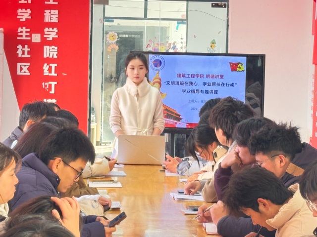 为扎实推动学院学风建设,全力营造积极向上、团结互助的浓郁学习氛围,充分发挥师生党员在学风建设中的引领作用,切实解决学生在学习中面临的 “急难愁盼” 难题。12月18日下午,建筑工程学院在A栋红灯塔“一站式”社区开展“明德讲堂”之“文明班级在我心,学业帮扶在行动”学业指导专题讲座。本次讲座由建筑工程学院学工办张丽雅老师主讲,各班学委、班长及各年级学困生代表参加会议。