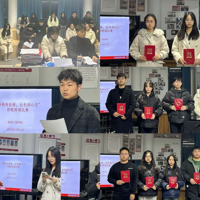 红歌声声,召唤着尘封的记忆,声声红歌,讴歌着奋进的时代。12月中旬,建筑工程学院举办“诗韵传佳情,红色润心灵”诗歌朗诵比赛,活动中,选手们以慷慨激昂之声,抑扬顿挫之调,生动展现了中国共产党在革命历程中的艰辛与困苦,以及那份积极向上、拼搏进取的精神风貌,令观众深切感受到了革命的觉醒与烽火岁月的壮丽。