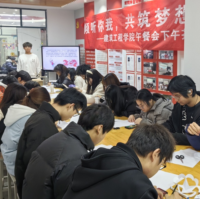 为了展示剪纸艺术及非物质文化遗产的独特魅力,提高学生对传统文化的认知与关注,12月26日,建筑工程学院筑心工作室在A栋一站式服务社区开展了“剪艺非遗,筑梦人生”的剪纸活动,让古老的剪纸艺术在校园中焕发出新的生机与活力。