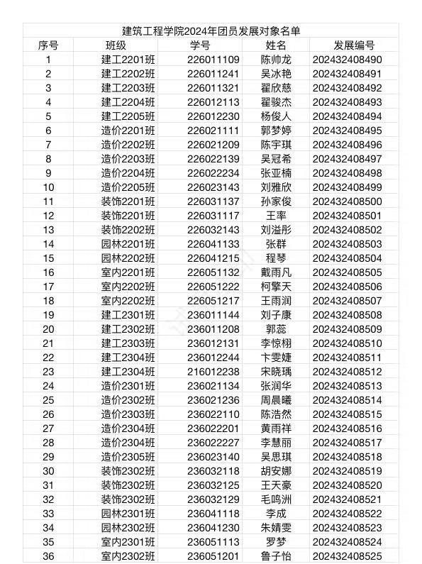 根据建筑工程学院团总支团员发展相关规定,结合我院实际情况,经各团支部公选推荐和院团总支审核,拟确定2260111班陈帅龙等36名同学(具体名单附后)作为团员发展对象,现予以公示,请各位老师、同学给予监督。