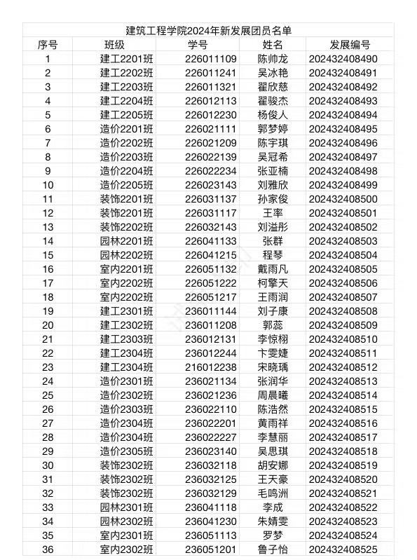 根据建筑工程学院团总支团员发展相关规定,结合我院实际情况,经各团支部公选推荐和院团总支审核,拟确定2260111班陈帅龙等36名同学(具体名单附后)作为2024年度新发展团员,现予以公示,请各位老师、同学给予监督。