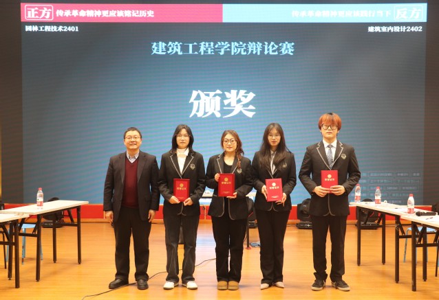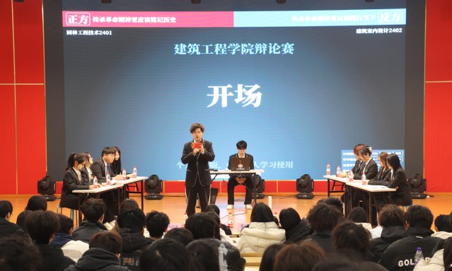 为激发青年学子对革命精神传承的思考,提高学生的思辨能力,建筑工程学院于2025年1月2日在大学生活动中心226室举办了第十九届“广宇杯”辩论赛总决赛。决赛辩题聚焦“传承革命精神更应铭记历史还是践行当下”,正方园林工程技术2401班与反方建筑室内设计2402班展开激烈交锋。建筑工程学院党总支书记张丽君、副书记彭涌涛、学工办辅导员担任本次活动评委。