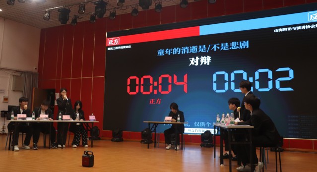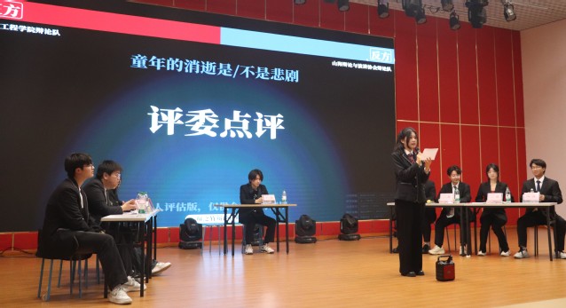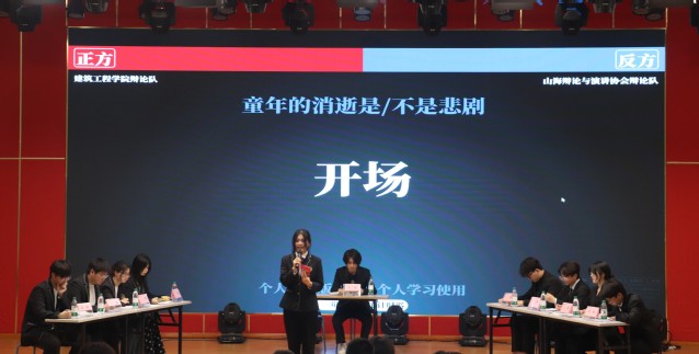本次决赛的辩题为“童年的消逝是不是悲剧”。由正方建筑工程学院辩论队和反方山海辩论协会展开辩论,比赛战况激烈,同学们互不相让,观点明晰,针锋相对,赛况十分焦灼。正方的辩手从“童年受社会影响”一词入手,阐述了“童年的成长受社会消极环境影响”这一观点,通过引用具体事例以及严谨的逻辑推理,详细阐述了悲剧产生的根源在于消逝与失去之间的理解偏差,而这一偏差是不可逆转的悲剧。并且他们进一步指出在媒体环境的视角下,童年的消逝无疑是悲剧。这种对己方观点进行的拓展与延伸有力地突显了其观点的合理性。