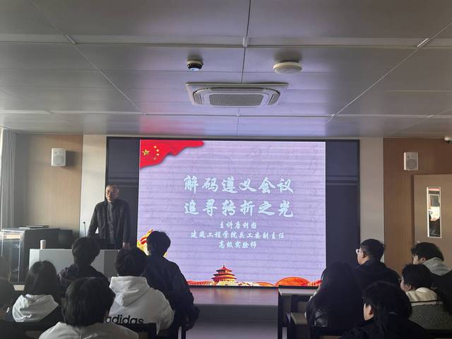 为纪念遵义会议召开90周年,引导广大入团积极分子从党的光辉历史中汲取精神滋养、坚定理想信念,11月12日,建筑工程学院关工委在广宇楼502开展《解码遵义会议追寻转折之光》主题信仰公开课。本次课程由学院关工委常务副主任唐利国主讲,与2025年下半年全体入团积极分子110余人共同追寻那段波澜壮阔的历史中的“转折之光”。